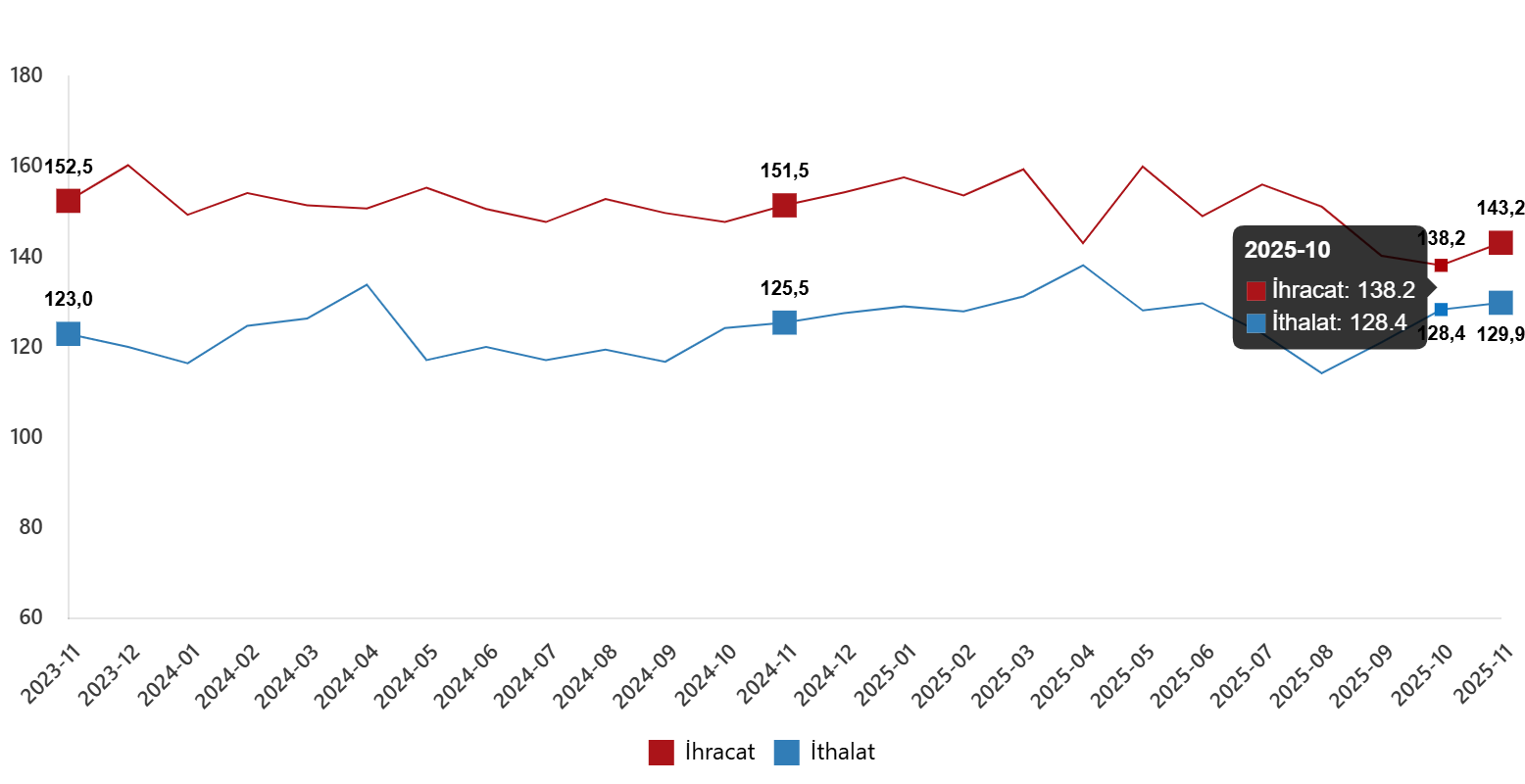 Mevsim ve takvim tesirlerinden arındırılmış seriye nazaran ihracat ölçü endeksi; 2025 Ekim ayında 138,2 iken 2025 Kasım ayında %3,6 oranında artarak 143,2 oldu. Takvim tesirlerinden arındırılmış seriye nazaran ise ihracat ölçü endeksi; 2024 yılı Kasım ayında 155,4 iken 2025 yılı Kasım ayında %5,6 oranında azalarak 146,7 oldu.