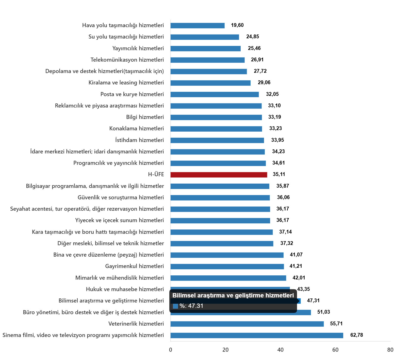 Bir evvelki yılın tıpkı ayına nazaran, ulaştırma ve depolama hizmetlerinde %32,32 artış, konaklama ve yiyecek hizmetlerinde %35,46 artış, bilgi ve bağlantı hizmetlerinde %34,32 artış, gayrimenkul hizmetlerinde %41,21 artış, mesleksel, bilimsel ve teknik hizmetlerde %40,33 artış, idari ve takviye hizmetlerde %37,92 artış gerçekleşti.