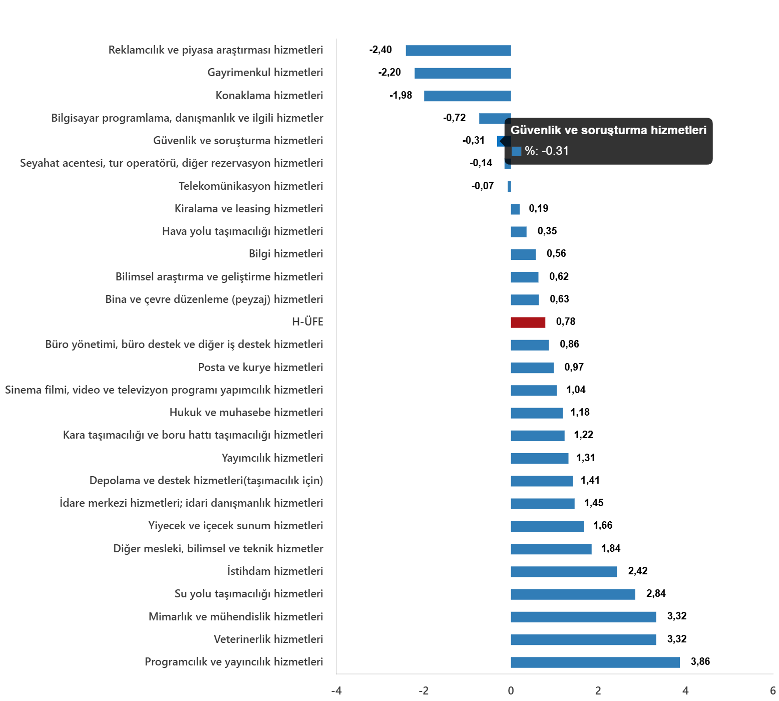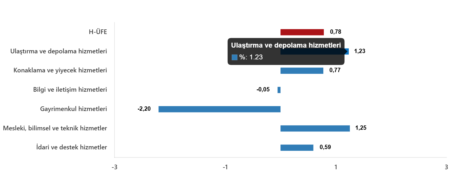 Bir evvelki aya nazaran, ulaştırma ve depolama hizmetlerinde %1,23 artış, konaklama ve yiyecek hizmetlerinde %0,77 artış, bilgi ve bağlantı hizmetlerinde %0,05 azalış, gayrimenkul hizmetlerinde %2,20 azalış, mesleksel, bilimsel ve teknik hizmetlerde %1,25 artış, idari ve takviye hizmetlerde %0,59 artış gerçekleşti.