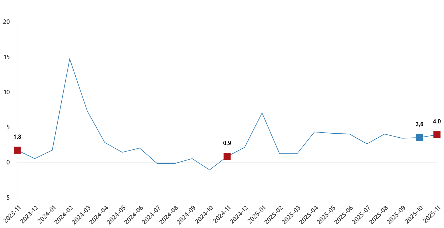 Hizmet üretim endeksi (2021=100) 2025 yılı Kasım ayında bir evvelki yılın tıpkı ayına nazaran %4,0 arttı. Birebir ayda ulaştırma ve depolama hizmetleri %1,6 arttı, konaklama ve yiyecek hizmetleri %7,2 arttı, bilgi ve bağlantı hizmetleri %8,7 arttı, gayrimenkul hizmetleri %3,0 arttı, mesleksel, bilimsel ve teknik hizmetler %1,7 arttı, idari ve dayanak hizmetleri ise %5,1 arttı.