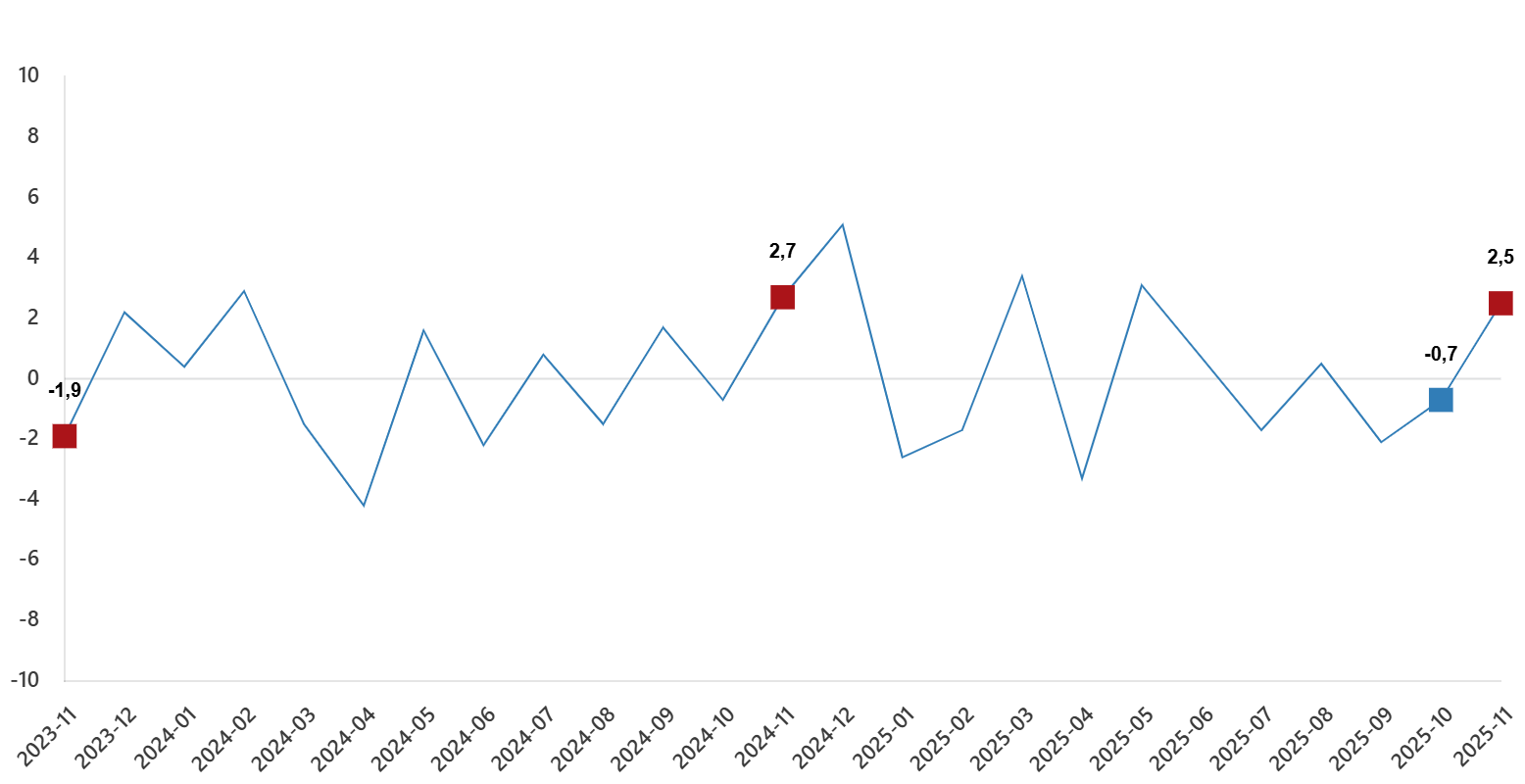 Sanayi üretim endeksi aylık değişimleri(%), Kasım 2025