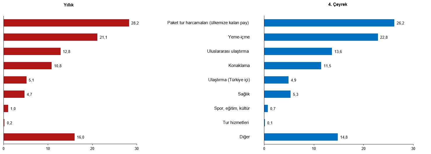 Bu çeyrekte ziyaretçilerden elde edilen turizm geliri içerisindeki paket çeşit harcamalarının hissesi %26,2, yeme içme harcamalarının hissesi %22,8, milletlerarası ulaştırma harcamalarının hissesi ise %13,6 oldu. Bir evvelki yılın birebir çeyreğine nazaran paket cins harcamaları %5,5, yeme içme harcamaları %20,8 ve memleketler arası ulaştırma harcamaları %15,2 arttı.